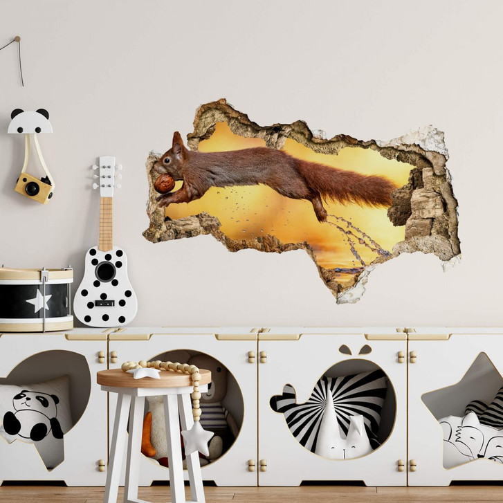 3D-Wandsticker in täuschend echter Optik zeigt ein niedliches Eichhörnchen in freier Wildbahn