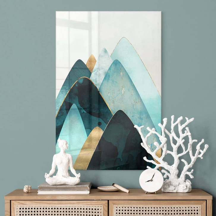 Acrylglasbild „Abstrakte Berge in Gold und Blau“ – Moderne Eleganz für dein Zuhause