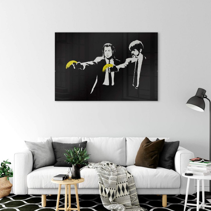 Verabschiede dich von langweiligen Wänden und bringe ein wenig Leben in dein Zuhause! Schmücke deine leeren Wände mit dem gesellschaftskritischen Graffiti des berühmten Strassenkünstlers Banksy. Das Acrylglasbild „Pulp Fiction“ zeigt eine berühmte Szene aus dem Kultfilm. Das Gemälde entstand 2003 in London und wurde 2007 zerstört. Die Darstellung der beiden Auftragskiller Vincent Vega und Jules Winnfield machte John Travolta und Samuel L. Jackson weltberühmt. Banksy ersetzt die beiden Pistolen durch Bananen. Die leuchtend gelbe Farbe der Bananen ist das einzige Highlight in der ansonsten monochromen Komposition.