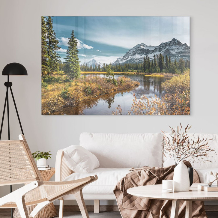 Dieses Acrylglasbild fängt die beeindruckende Ruhe und Schönheit einer Berglandschaft ein. Im Vordergrund spiegelt sich ein klarer See, umgeben von goldenen Herbstfarben, während im Hintergrund majestätische, schneebedeckte Gipfel die Szenerie dominieren. Der blaue Himmel mit sanften Wolkenformationen verleiht dem Bild Tiefe und lässt die Landschaft endlos erscheinen.