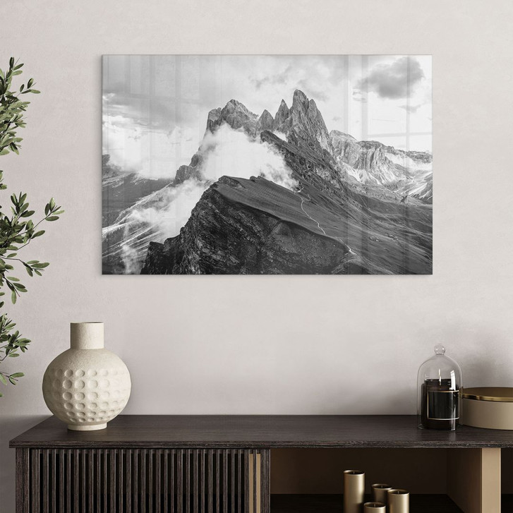 Erlebe die imposante Schönheit der Dolomiten auf einem eindrucksvollen Acrylglasbild in Schwarz-Weiss. Dieses Motiv fängt die majestätische Bergwelt der Alpen in all ihrer Dramatik ein: raue Felsformationen, die sich in den Himmel erheben, und weiche Wolken, die die schroffen Konturen streicheln. Die monochrome Darstellung verstärkt die Tiefe und kontrastreichen Details der Landschaft und verleiht dem Bild eine zeitlose, künstlerische Ästhetik.