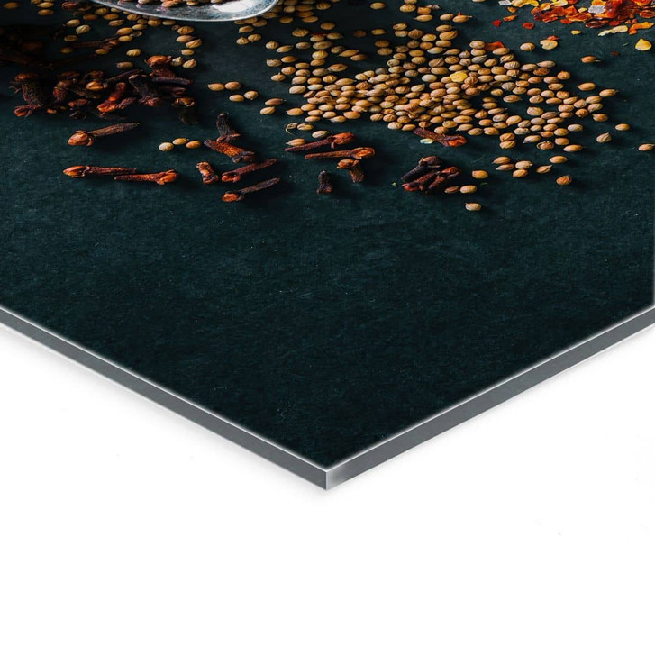 Diese eindrucksvolle Acrylglasplatte bringt die bunte und faszinierende Welt der Gewürze direkt in die Küche oder das Restaurant. Mit einer Komposition aus verschiedenen Gewürzen, die in antiken Löffeln präsentiert werden, entsteht ein dekoratives Kunstwerk, das stilvoll und inspirierend zugleich ist.