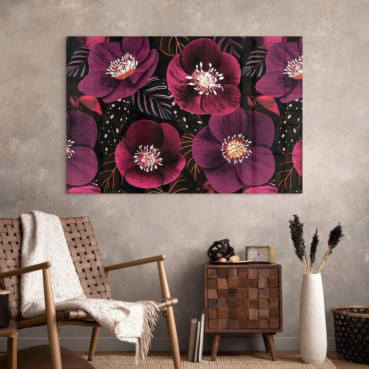 Ein Hauch von Luxus und zeitloser Eleganz – dieses Acrylglasbild bringt mit seiner intensiven Farbgebung und floralen Schönheit einen ausdrucksstarken Akzent in Ihr Zuhause. Die tiefen Violetttöne der opulenten Blüten heben sich eindrucksvoll vom dunklen Hintergrund ab und erzeugen ein faszinierendes Spiel aus Licht und Schatten. Die detaillierten Blütenblätter und zarten Blattmuster verleihen dem Motiv eine dynamische Tiefe und lassen es fast dreidimensional erscheinen.