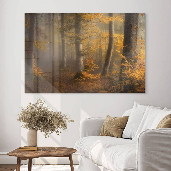 Acrylglasbild Goldene Blätter im nebligen Wald - Maier