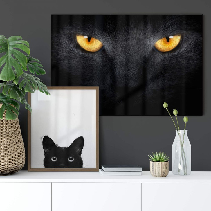 Zaubere mit diesem Accessoire ein neues Wohlgefühl und verleihe deinen Wänden das passende Outfit. Das Foto schafft ein warmes Raumgefühl und erweitert deinen Blick – lass dich überraschen. Katzen sind für viele Tierliebhaber die beliebtesten Haustiere. Die neugierigen Tiere spielen und kuscheln mit dir und vertreiben dir auf liebevolle Weise langweilige und einsame Stunden. Der treue Hauskater ist sehr unabhängig und kann in der Regel für sich selbst sorgen. Diese schwarze Katze mit ihren hellen, auffälligen Augen zaubert eine geheimnisvolle und zugleich gemütliche Atmosphäre. Ein Muss für alle Katzenliebhaber! Und das Acrylglasbild mit seiner besonderen Oberfläche sorgt für ein besonders hochwertiges Highlight in deinen vier Wänden. Leichter als Glas, aber nicht weniger attraktiv: Seine schwarzen Farben strahlen auf dem Material sehr intensiv und heben das Motiv hervor.