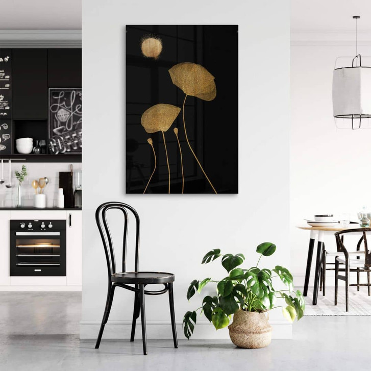 Mache mehr aus deinem Zuhause und verschönere deine Wand mit diesem Wandaccessoire! Der Kunstdruck von Kubistika zeigt goldene Mohnblumen, die sich vor einem schwarzen Hintergrund dem Mond entgegenstrecken.