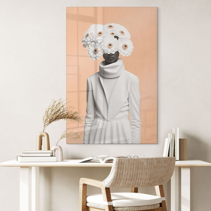 Wanddekoration ist ein wichtiger Bestandteil eines geschmackvoll eingerichteten Zuhauses. Hochwertige Bilder werten das Interieur stilvoll auf und schaffen eine Atmosphäre zum Wohlfühlen. Der Kunstdruck von Treechild ist ein echter Hingucker an der Wand! Eine Frau in schicker weisser Kleidung trägt einen auffälligen Blumenkopfschmuck. Das Weiss kontrastiert wunderschön mit der pfirsichfarbenen Hintergrundfarbe.