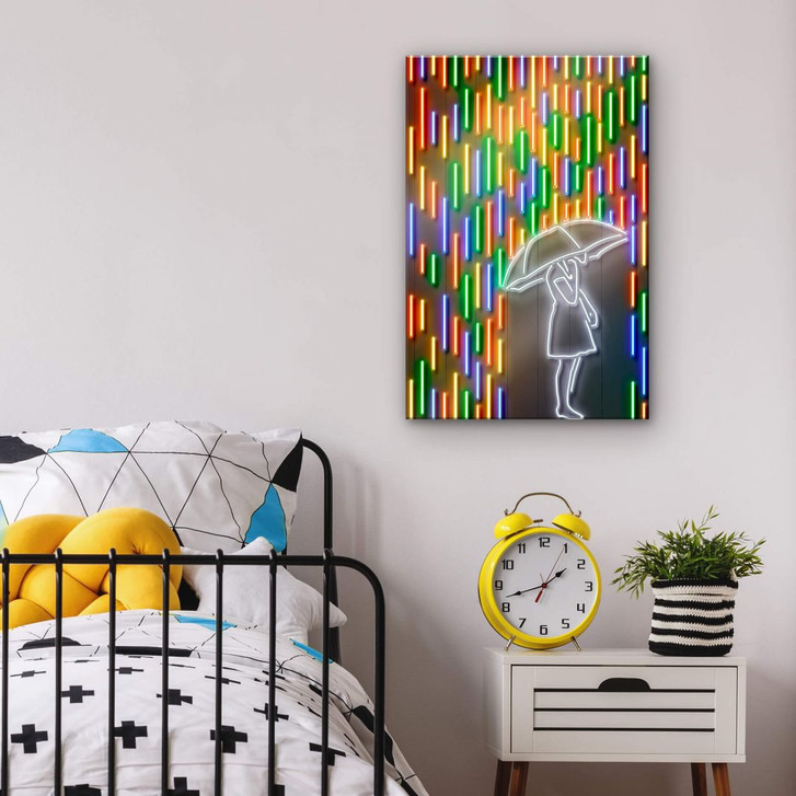 Lass dir vom Regen nicht die Laune verderben. Nimm ein heisses Bad, lies ein spannendes Buch und höre Lieder, die schöne Erinnerungen wecken. Das farbenfrohe Motiv mit dem Mädchen, das im neonfarbenen Regen steht, hebt die Stimmung an Regentagen.