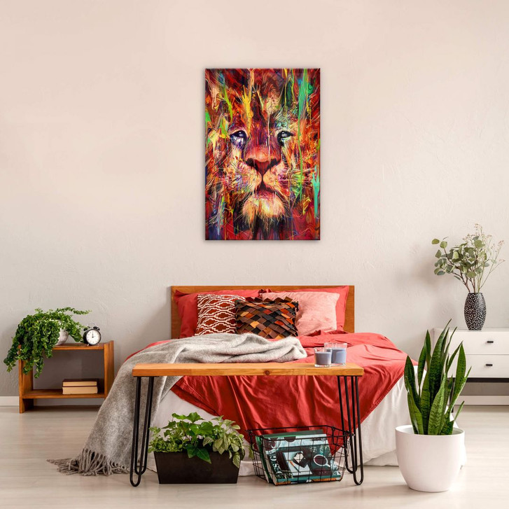 Der Löwe steht für Mut, Stärke und Stolz. Er präsentiert sich majestätisch in leuchtenden Rottönen. Bei genauerem Hinsehen erkennt man viele weitere Farben, die wie zufällig in dünnen Linien gemalt zu sein scheinen. Die künstlerische Arbeit weckt in uns einen starken Willen und Entschlossenheit.
