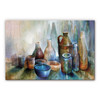 Das Motiv der zeitgenössischen Künstlerin Annette Schmucker zeigt ein kunstvoll interpretiertes Stillleben aus Flaschen und Schalen in auffälligen Blautönen.