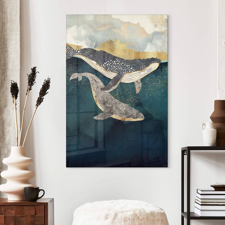 Es sind die kleinen Dinge, die das Leben schön machen. Lass dich von unserer grossen Auswahl an Designs inspirieren und verschönere dein Zuhause ganz nach deinem persönlichen Geschmack! Der Kunstdruck von SpaceFrog Designs entführt dich in die unendliche Weite des Ozeans. Zu sehen sind zwei graue Buckelwale, die harmonisch nebeneinander durch das blaue Wasser schwimmen.