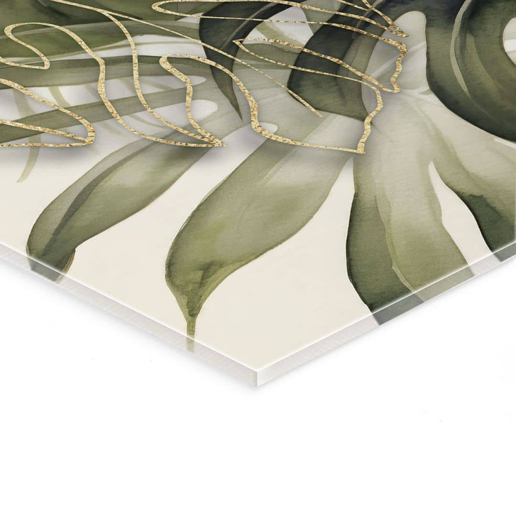 Entdecke die Harmonie der Natur in Form eines stilvollen Kunstwerks, das dein Zuhause in eine Oase der Ruhe verwandelt. Dieses hochwertige Acrylglasbild zeigt eine kunstvolle Komposition aus tropischen Blättern in sanften, erdigen Tönen, die sofort eine beruhigende Atmosphäre schaffen. Die detailgetreue Darstellung der Blätter, kombiniert mit dezenten goldenen Akzenten, verleiht dem Bild eine luxuriöse Note, die sowohl moderne als auch klassische Einrichtungsstile perfekt ergänzt.