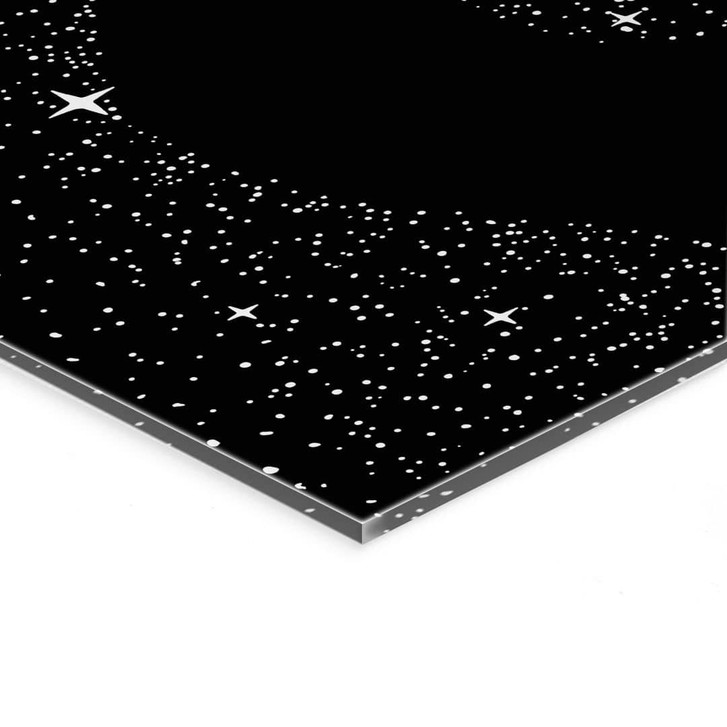Das Kunstwerk ist auf hochwertigem Acrylglas gedruckt, wodurch die schwarz-weisse Komposition besonders eindrucksvoll zur Geltung kommt. Die glänzende Oberfläche verstärkt die Tiefe der Sterne und sorgt für einen edlen Look. Dank der brillanten Druckqualität und der robusten Verarbeitung bleibt die Intensität des Motivs langfristig erhalten.