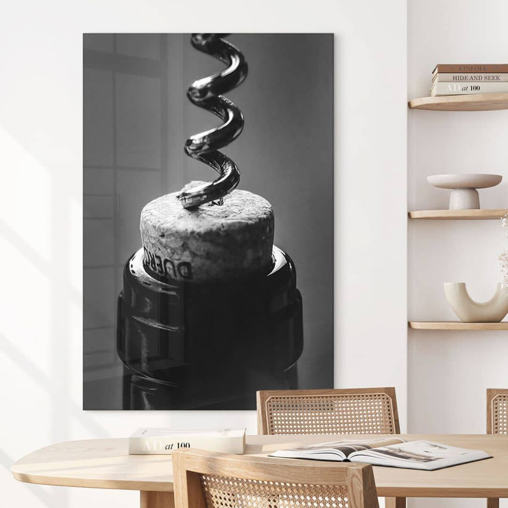 Verleihe deiner Küche, Weinbar oder deinem Restaurant mit diesem beeindruckenden Acrylglasbild eine stilvolle Note. Das Motiv, das den Moment einfängt, in dem der Korkenzieher sanft in den Korken einer edlen Weinflasche eindringt, verkörpert die Essenz von Genuss und Hingabe. Das hochwertige Schwarz-Weiss-Bild bringt eine elegante und zeitlose Atmosphäre in Ihr Zuhause und ist ein echter Hingucker für Weinliebhaber.