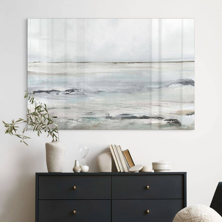 Dieses wunderschöne abstrakte Landschaftsgemälde zeigt Sandy Bay, eine etwa zwei Kilometer breite Bucht in der Nähe von Exmouth in der Grafschaft Devon an der Kanalküste Englands. Die raue See und der graue Himmel vermitteln ein Bild von leichter Traurigkeit, aber auch von der absoluten Lebendigkeit und Freiheit dieses wunderbaren Ortes.