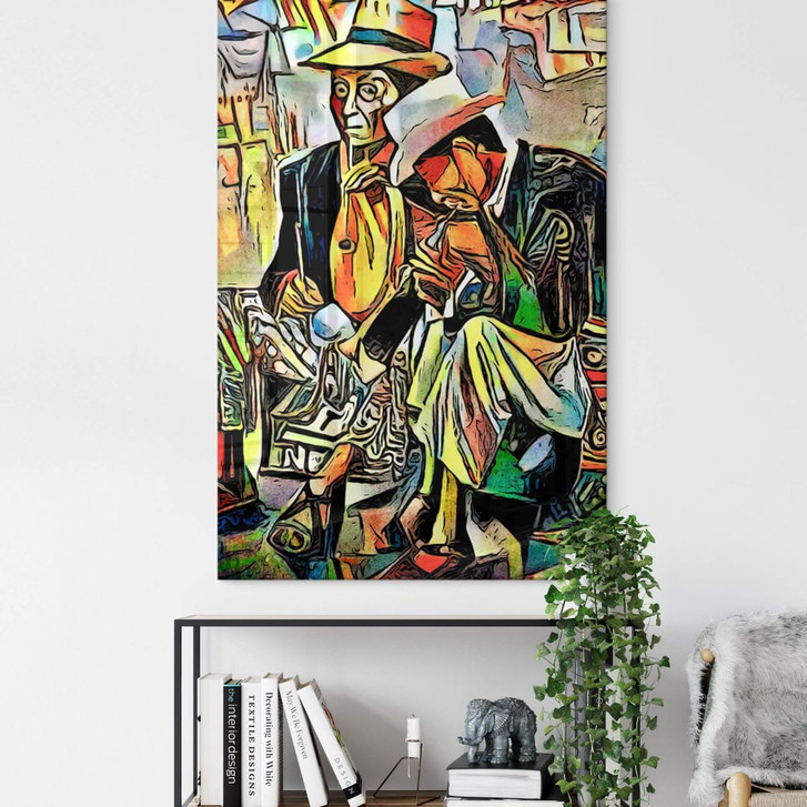 Das abstrakte Bild zeigt zwei Musiker auf der Strasse, die ihrer Leidenschaft nachgehen. Das Motiv stammt von der Künstlerin Zamart, die gerne in verschiedene Länder der Welt reist und ihre spontanen Bildideen oft direkt vor Ort skizziert. Mit diesem kubistischen Kunstwerk holst du dir moderne Kunst ins Haus, die in vielen Bereichen eingesetzt werden kann. Ob im Eingangsbereich, in Büros oder Hotelzimmern: Das farbenfrohe Gemälde sorgt auch sofort für eine einladende Atmosphäre.