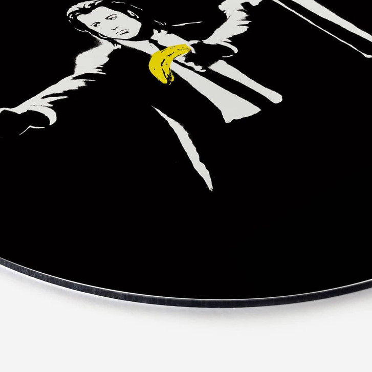 Richtig gemütlich wird es in deinem Zuhause erst mit den richtigen Bildern an der Wand. Verleihe deinen vier Wänden mit diesem Motiv eine ganz persönliche Note! Das runde Wandbild aus Aluminium-Dibond zeigt eine berühmte Szene aus dem Kultfilm „Pulp Fiction“. Das Graffiti von Banksy entstand 2003 in London und wurde 2007 zerstört. Die Darstellung der beiden Auftragskiller Vincent Vega und Jules Winnfield machte John Travolta und Samuel L. Jackson weltberühmt. Banksy ersetzt die beiden Pistolen durch Bananen. Mit ihrer leuchtend gelben Farbe sind diese das einzige Highlight in dem ansonsten monochromen Werk.