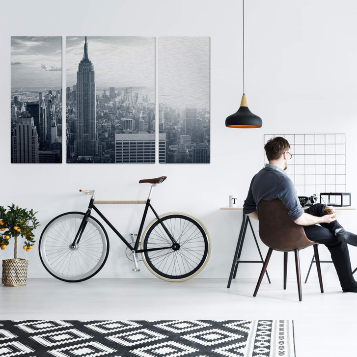 New York aus der Luft! Ein tolles Motiv für alle, die diese Metropole lieben. Das Highlight dieses Motivs ist die Luftaufnahme des Empire State Buildings bei Sonnenuntergang. Träumt nicht länger von eurer Reise nach New York, sondern holt euch euer Lieblingsmotiv von Manhattan direkt nach Hause. Dieses wunderschöne Motiv besteht aus drei einzelnen Bildern (40 x 100 cm, 70 x 100 cm, 40 x 100 cm).