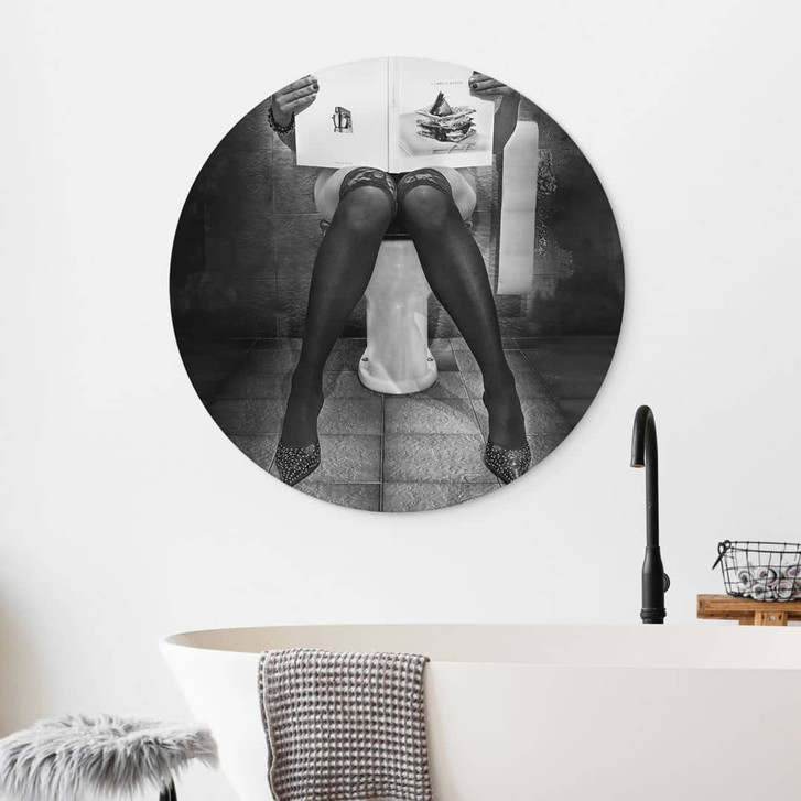 Das Badezimmer ist ein Ort der Diskretion und absoluten Privatsphäre. Das Foto des Fotokünstlers Toniolo zeigt gekonnt ein spannendes Zusammenspiel ambivalenter weiblicher Bilder in dieser Umgebung. Eine durch und durch stilbewusste, hübsche Frau sitzt auf der Toilette, gekleidet in provokante Spitzenstrumpfhalter und Stilettos, während sie in ein Rezeptbuch vertieft ist. Unwiderstehlich weiblich, multitaskingfähig und gleichzeitig die perfekte Hausfrau? Ein optimales Spiel mit den typischen Stereotypen einer Frau in Schwarz-Weiss. Das Motiv ist perfekt für deine Lieblingsecke im Badezimmer.