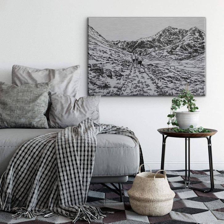 Imposante Berglandschaft, weitläufige Aussicht und ein einsamer Weg, der zum Wandern einlädt. Mitten in einer idyllischen Landschaft zu sein, bedeutet, Ruhe und innere Gelassenheit zu finden. Wer es lieber schlicht mag, aber dennoch nicht auf die feinen Details verzichten möchte, liegt mit dieser Zeichnung genau richtig. Das minimalistische Bild wirkt beruhigend und kann einem überladenen Raum entgegenwirken.