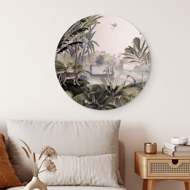 Gönne dir dieses dekorative Schmuckstück und fühle dich glücklich. Hol dir tropisches Dschungelflair nach Hause! Das runde Wandbild „Landschaft mit Leoparden“ von Sir Edward zeigt eine tropische Naturlandschaft, die durch ihre vielen kleinen Details begeistert. Am Ufer eines Flusses beobachten zwei Leoparden unter Palmen ein kleines Boot auf dem Wasser.