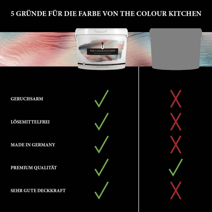 The Color Kitchen, eine innovative und trendige Wandfarbenmarke, wird in Deutschland mit Leidenschaft und Präzision hergestellt. Mit einer beeindruckenden Palette von 112 verschiedenen Farbtönen eröffnet sie dir nahezu unendliche Möglichkeiten, deiner Kreativität Ausdruck zu verleihen und deine Wohnräume in wahre Meisterwerke zu verwandeln.