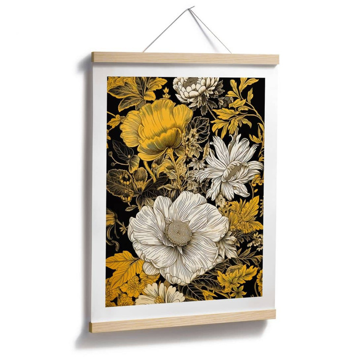 Lass dich von diesem Poster in eine unbeschwerte Wohlfühlzone entführen! Das Geheimrezept für eine harmonische Atmosphäre lautet: Blumen. Sie spiegeln die Schönheit der Natur wider und wirken in diesem Motiv zeitlos und ewig. Die Blüten und Blätter wurden in Weiss und Gelb dargestellt und bilden einen schönen Kontrast zum schwarzen Hintergrund. Ob als Einzelmotiv oder als Ergänzung zu echten Blumen und Pflanzen – die natürliche Schönheit dieses Wandbildes erweckt den Raum zum Leben und schafft eine beruhigende Atmosphäre. Im Hochformat präsentiert, eignet es sich besonders für Wohn- und Schlafzimmer. Der Druck erfolgt auf speziellem Plakatpapier, das mit seiner weissen Oberfläche für eine wunderbare Farbwiedergabe sorgt. Dieses Blumenposter ist perfekt für eine moderne Wandgestaltung im floralen Stil.