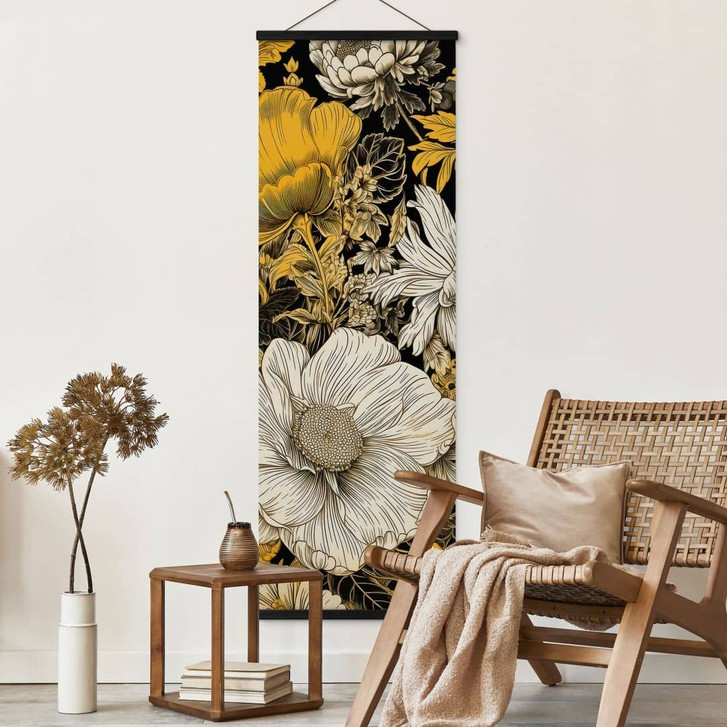 Dekoriere mit dem Leinwand-Wandbild und steigere die Wohnqualität in deinen eigenen vier Wänden! Die Zauberformel für eine bezaubernde Raumatmosphäre lautet: Blumen. Sie spiegeln die Schönheit der Natur wider und zeigen sich hier auf diesem Motiv als zeitlos und unvergänglich. Die Blüten und Blätter wurden in Weiss und Gelb dargestellt und bilden einen schönen Kontrast zum schwarzen Hintergrund. Ob als Einzelmotiv oder als Ergänzung zu echten Blumen und Pflanzen, diese Naturschönheiten als Textilbild beleben jeden Raum und schaffen ein harmonisches Raumgefühl. Justyna Jaszke ist Dichterin, Fotografin, Grafikdesignerin und Illustratorin. Sie entwirft Aquarellbilder mit Städten und Tieren sowie Motive zu den Themen Sport, Musik, Blumen und Pflanzen. Ihre Karriere als Grafikdesignerin begann 2015 und ist seitdem weltweit ein grosser Erfolg.