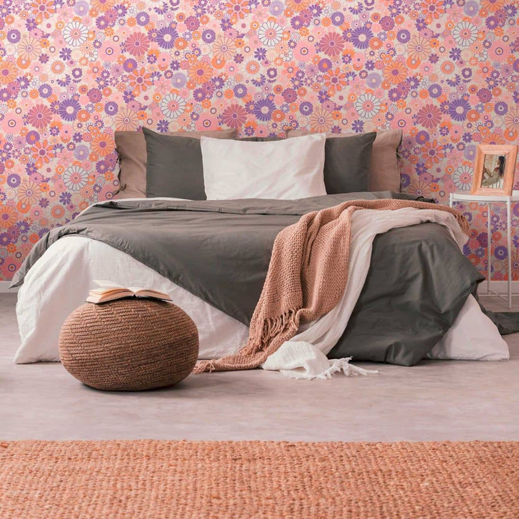 Blumentapete Lila Orange - florale Tapete im Retro-Stil - Vintage Vliestapete