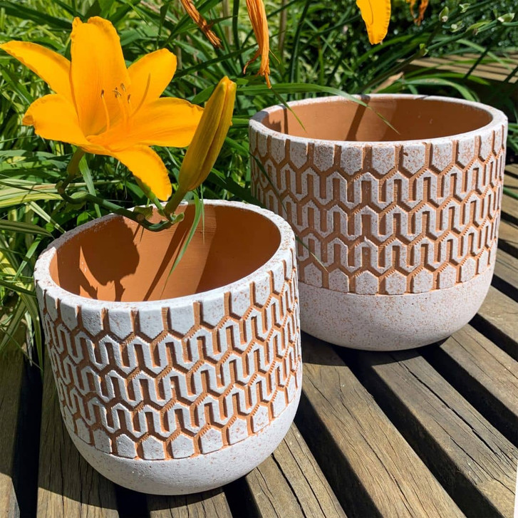 Dekorativ und stilvoll zugleich – mit diesem Blumentopf schaffst du einen wunderschönen Blickfang im Garten, auf dem Balkon und im Innenbereich. Mit seiner geometrischen Oberflächenstruktur passt der Blumentopf zu vielen verschiedenen Einrichtungsstilen und besticht durch sein robustes Material in den Farben Weiss und Orange. Auf den ersten Blick wirkt der Blumentopf rau und rustikal – bei näherer Betrachtung harmoniert er wunderbar mit Grünpflanzen und bunten Blumen. Ein schöner Kontrast, der Freude bereitet! Der Blumentopf ist frost- und wasserfest und daher ideal für den Aussenbereich geeignet. Der Topf im trendigen Design ist in zwei verschiedenen Grössen erhältlich.