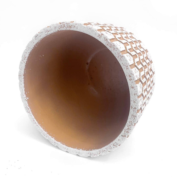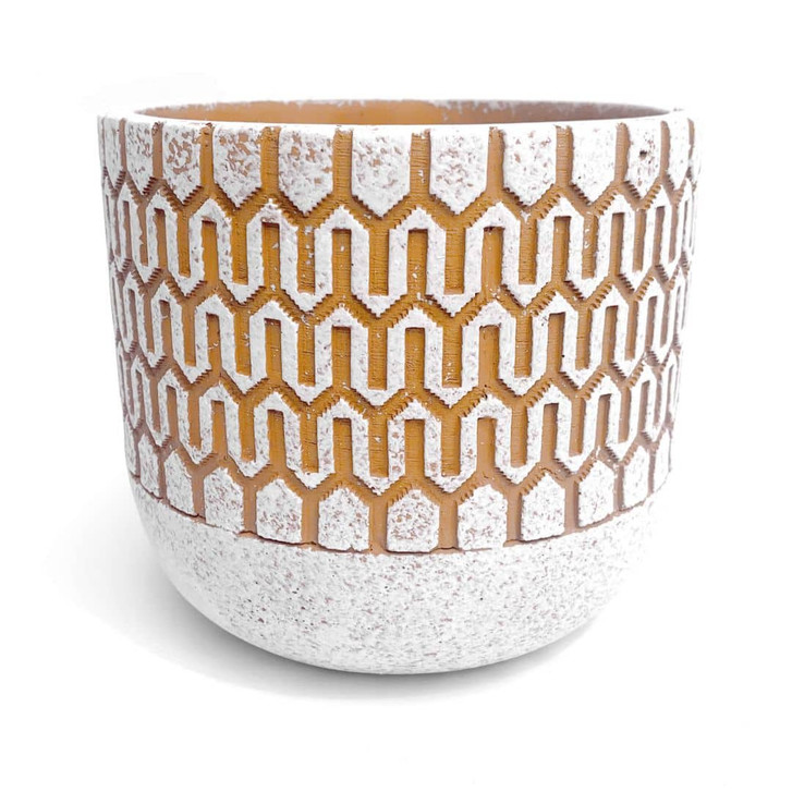 Dekorativ und stilvoll zugleich – mit diesem Blumentopf schaffst du einen wunderschönen Blickfang im Garten, auf dem Balkon und im Innenbereich. Mit seiner geometrischen Oberflächenstruktur passt der Blumentopf zu vielen verschiedenen Einrichtungsstilen und besticht durch sein robustes Material in den Farben Weiss und Orange. Auf den ersten Blick wirkt der Blumentopf rau und rustikal – bei näherer Betrachtung harmoniert er wunderbar mit Grünpflanzen und bunten Blumen. Ein schöner Kontrast, der Freude bereitet! Der Blumentopf ist frost- und wasserfest und daher ideal für den Aussenbereich geeignet. Der Topf im trendigen Design ist in zwei verschiedenen Grössen erhältlich.