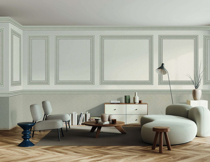Unsere breiten und klassischen Bordüren eignen sich besonders für die Tapezierung unter der Decke. Wir wollten viel Dreidimensionalität simulieren und mit den starren Gestaltungsmöglichkeiten des „Streifen-Zusammenklebens“ brechen.