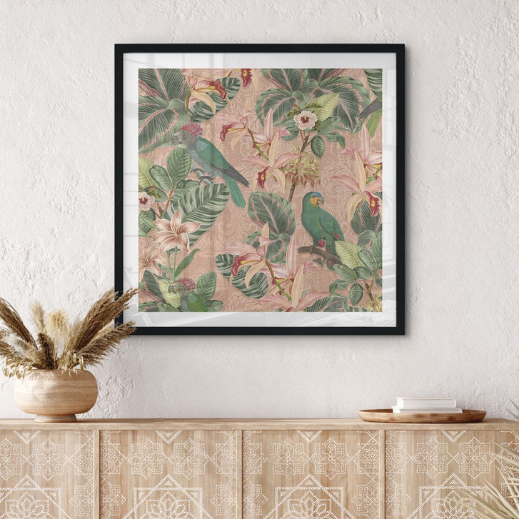Botanik Poster Dschungel mit Papageien Rosa - Bloomery Decor - Quadratisch