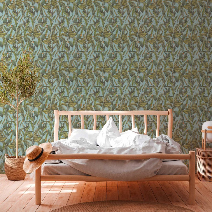 Dschungel-Tapete Blau Grün - Vliestapete floral mit Blättern und Blüten