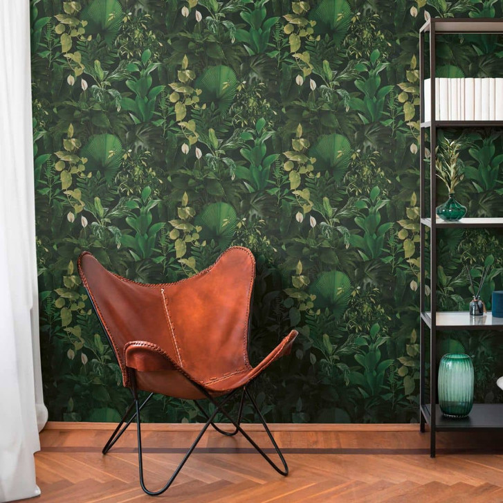 Pintwalls II - Exotische Vliestapete mit tropischen Blättern in Grün und Schwarz für eine lebendige und stilvolle Wandgestaltung.