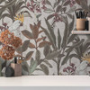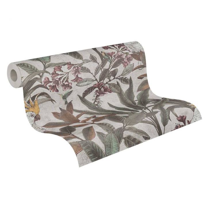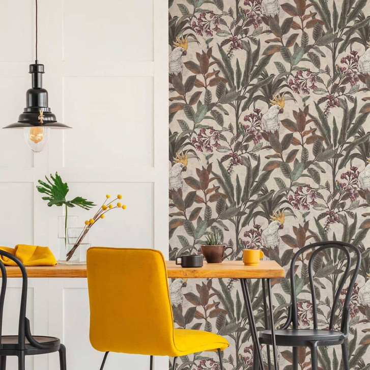 Pintwalls II - Vliestapete mit exotischem Kakadu und tropischen Pflanzen in Beige, Grün und Lila.