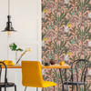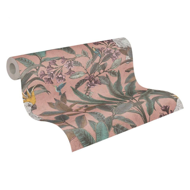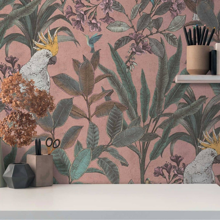Pintwalls II - Detailreiche Vliestapete mit tropischem Kakadu-Motiv, exotischen Pflanzen und Blüten in Rosa, Grün und Gelb.