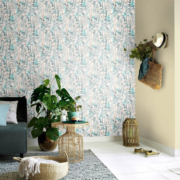 Die Vliestapete COTTAGE erinnert mit zarten Blättern und Gräsern an eine üppige Blumenwiese.