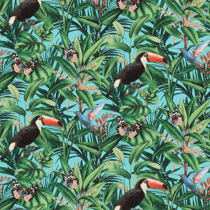 Zierliche Kolibris, exotische Tukane und tropische Pflanzen erzeugen bei dieser Vliestapete Dschungelfeeling pur.
