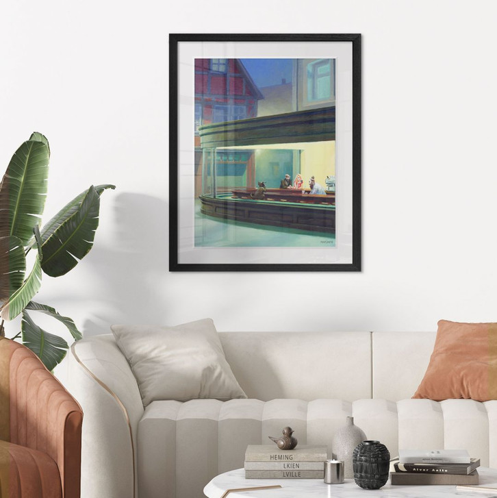 Verabschiede dich von leeren Wänden und bringe einen Hauch von Kreativität in dein Zuhause! Das Motiv stammt von Wolf-Rüdiger Marunde und zeigt einen Hund, der an der Bar eines Diners sitzt und telefoniert. Dieses Gemälde wurde von „Nighthawks“ des Malers Edward Hopper inspiriert.