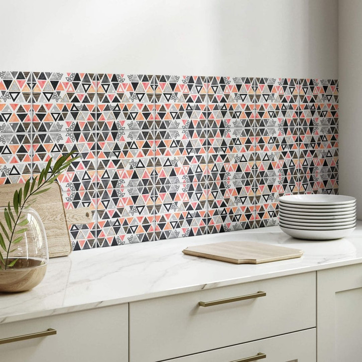 Fliesenaufkleber mit geometrischen Mustern werten deine Küche schnell und einfach auf.