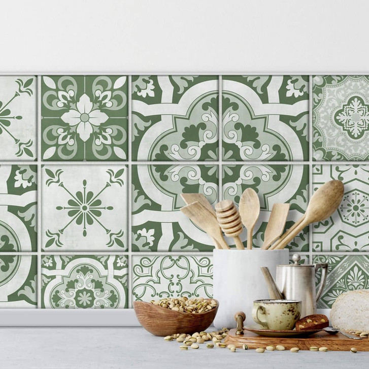Die Renovierung von Küche oder Bad kann so einfach sein, wenn du dich für die grün-weissen „Ornaments“-Fliesenaufkleber entscheidest. Kein Aufkleber gleicht dem anderen!