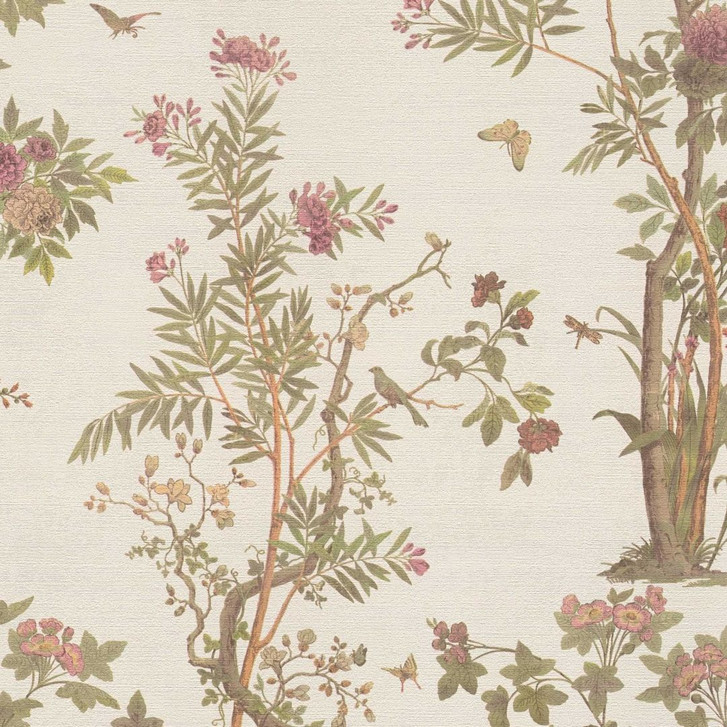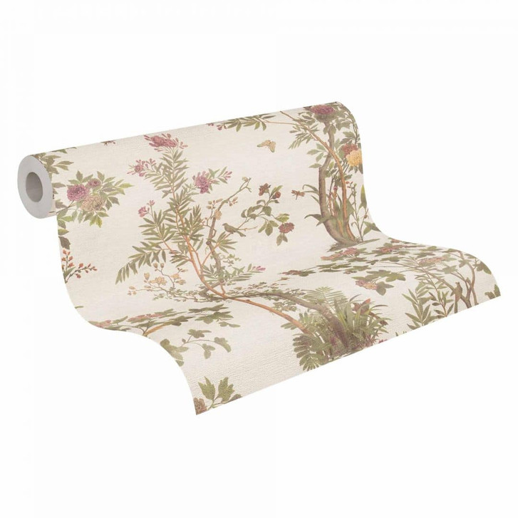 Florale Mustertapete mit Schmetterlingen Beige Grün Rosa - Vliestapete Naturmotiv