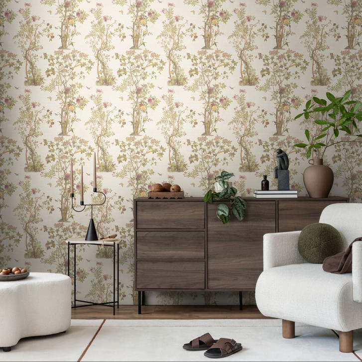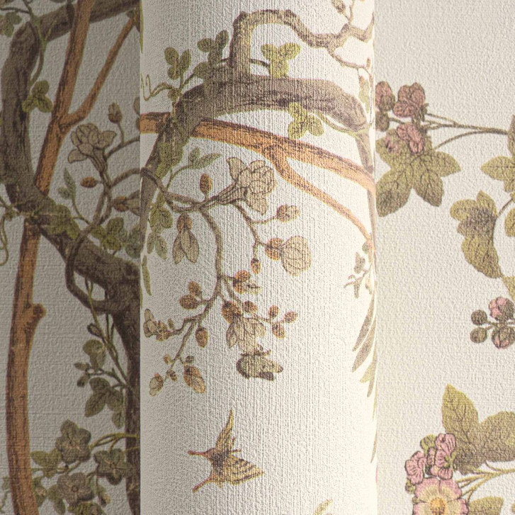 History of Art 2 - Elegante Mustertapete mit zarten Blumen und Schmetterlingen auf beigem Hintergrund.