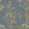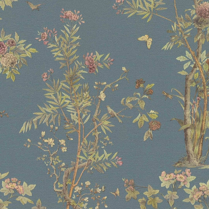 History of Art 2 - Harmonische Mustertapete mit floralen Elementen und Schmetterlingen auf blauem Hintergrund.