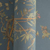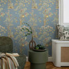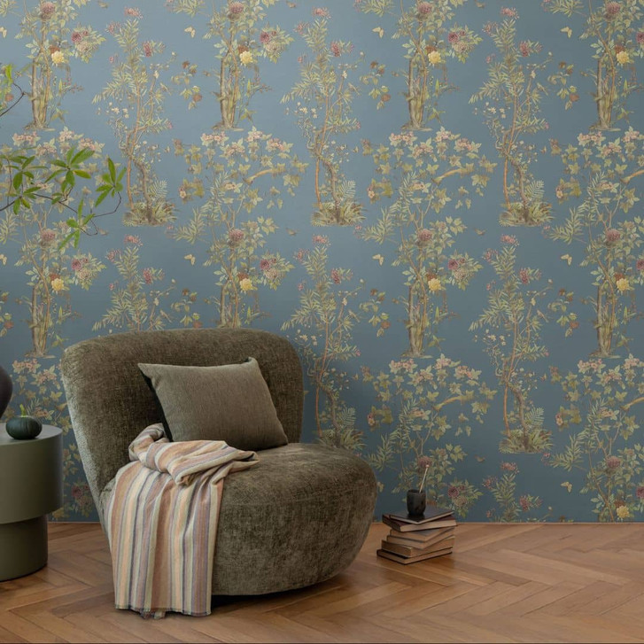 History of Art 2 - Harmonische Mustertapete mit floralen Elementen und Schmetterlingen auf blauem Hintergrund.