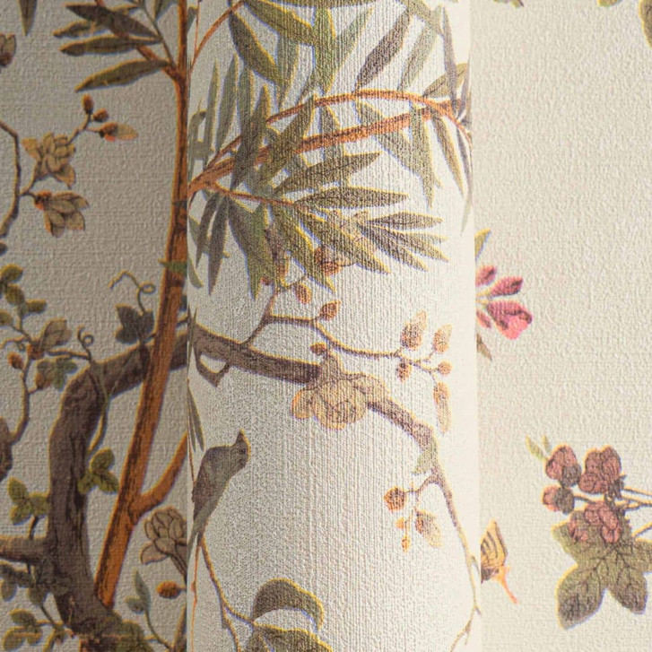 History of Art 2 - Romantische Mustertapete mit floralen Elementen und Schmetterlingen auf cremefarbenem Hintergrund.
