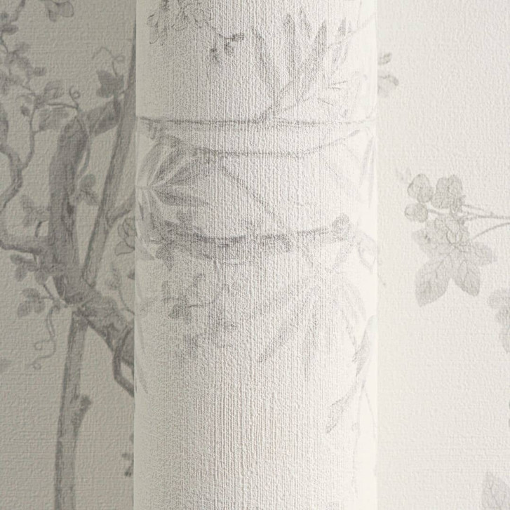 History of Art 2 - Zarte Mustertapete mit floralen Motiven und Schmetterlingen in Hellgrau auf weißem Hintergrund.