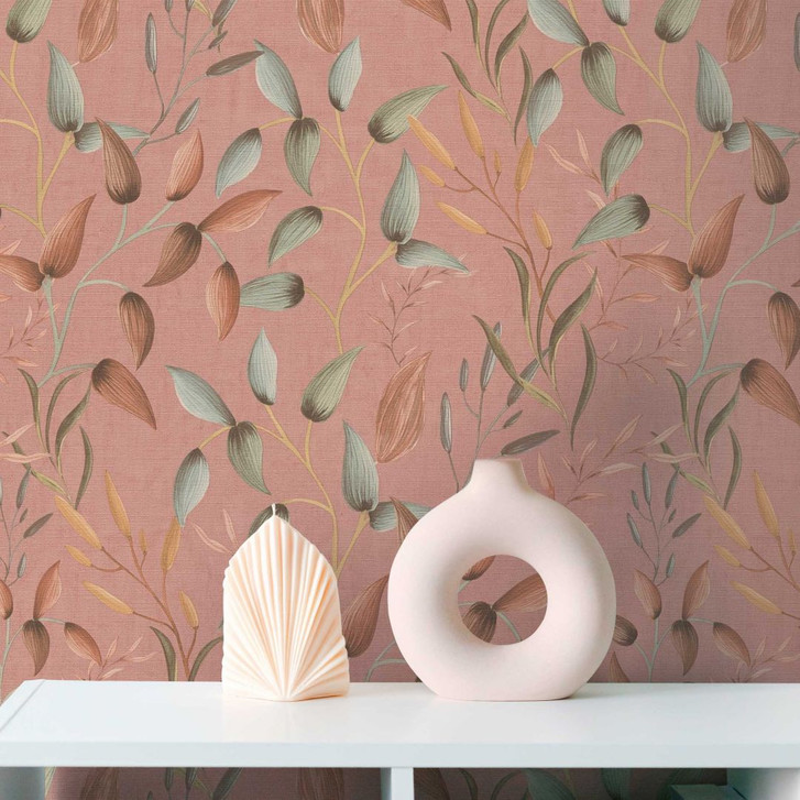 Pintwalls II - Zarte Vliestapete mit filigranem Blättermuster in Altrosa, Grün und Braun für eine warme und elegante Wandgestaltung.