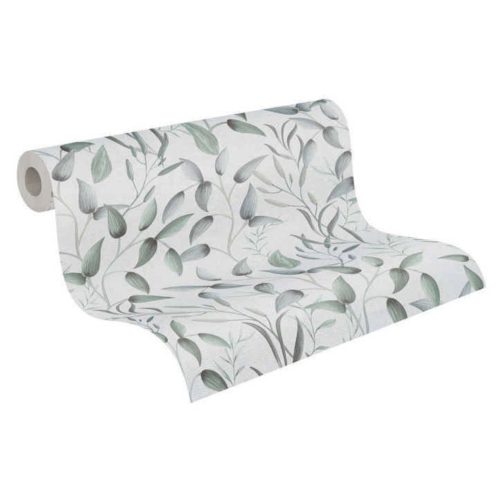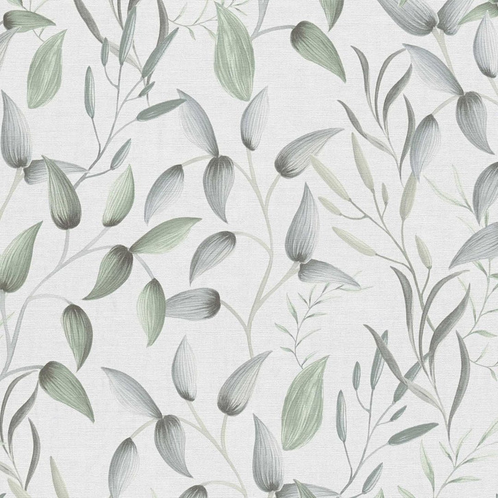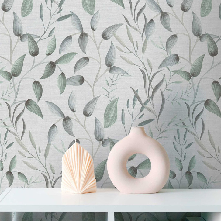Pintwalls II - Zarte Vliestapete mit filigranem Blättermuster in Grün, Grau und Weiß für eine natürliche und elegante Wandgestaltung.